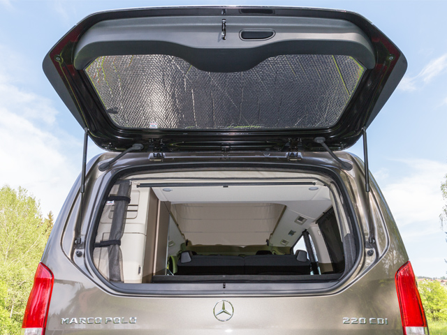 ISOLITE Inside is available for the tailgate window of the Mercedes-Benz Marco Polo (2014 –>). Simple attachment with hook-and-loop fastener.