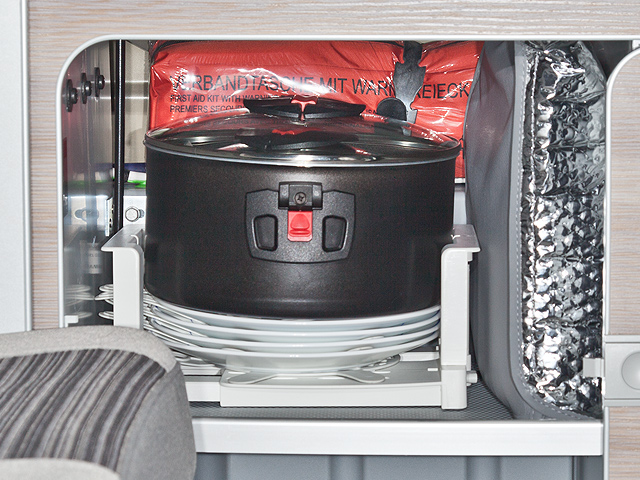 If you have plates for 3 people inside the plate holder, additionally a cooking set fits into the plate holder, saving a lot of space.