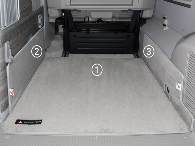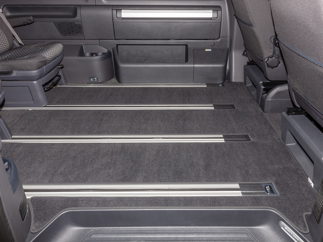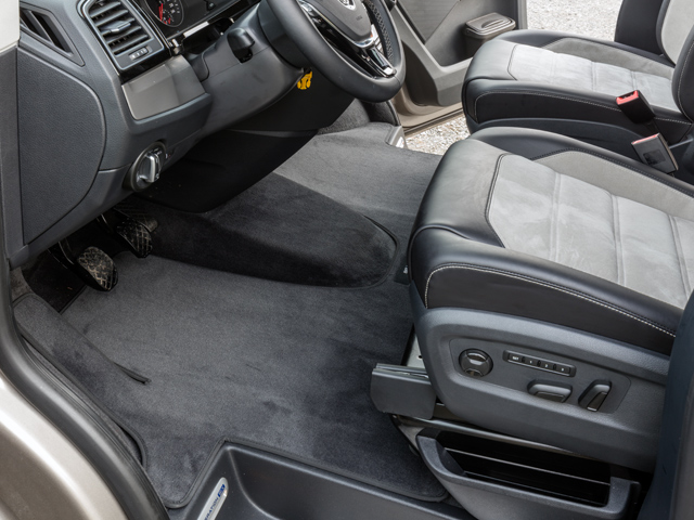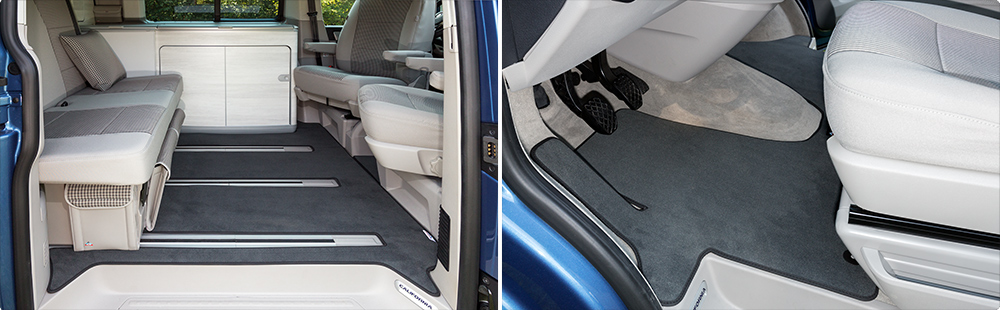 The velour carpets for VW T6.1/T6/T5 Multivan / VW T6.1 California Beach Tour/Camper are precisely tailored, very hard-wearing and can be easily cleaned with a hoover as sand, dirt and dust cannot get into them.