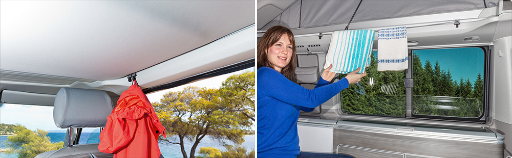 Coat-hooks and a towel rail for drying towels are indispensable in every camper van!