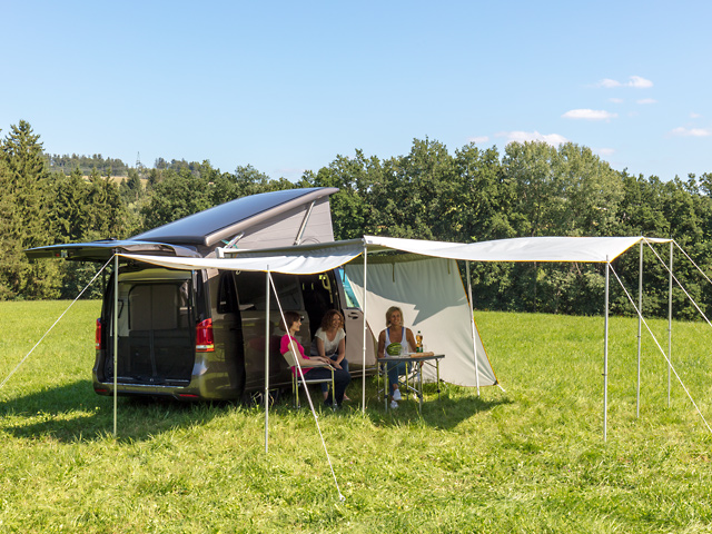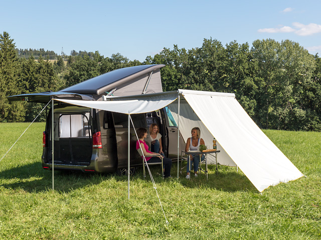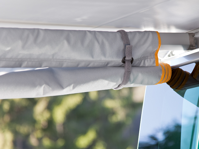 Lorsque la marquise est complètement enroulée, on peut aussi monter la paroi avant ou l’utiliser comme vélum autonome sur le côté gauche du véhicule, si l’on souhaite ombrager le véhicule sur les deux côtés