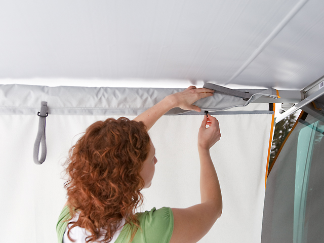 La paroi avant de la marquise sera fixée par un cordon spécial, soit au côté avant de la marquise, soit au rail en aluminium de la Mercedes-Benz Marco-Polo ou encore au TOP-RAIL. Garder la tension au sol élastique et souple.