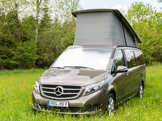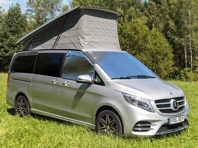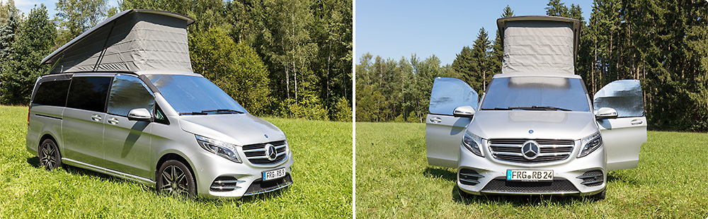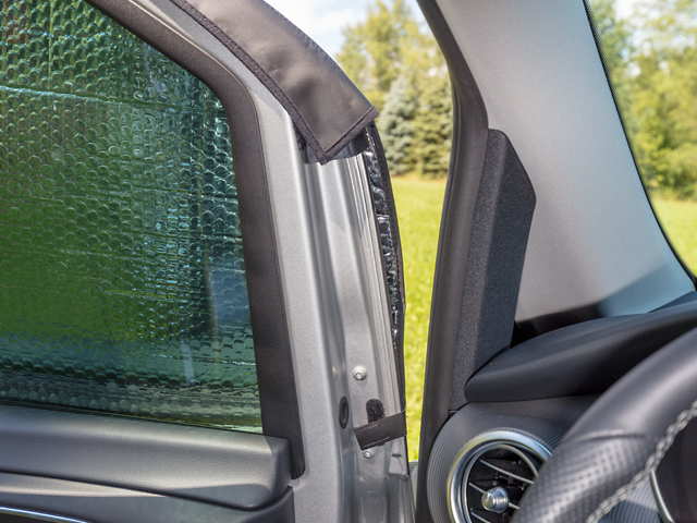 Les ISOLITE Outdoor pour les fenêtres situées à côté de la cabine-conducteur de la Mercedes-Benz Classe-V (2014 –>) sont fixés, au-dehors, aux portières de la cabine avant et recouvrent entièrement les fenêtres des portières.