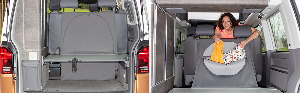 Le sac à dos de banquette FLEXBAG offre un rangement d’environ 266 l lorsque la banquette 2 places du California VW est avancée au maximum : beaucoup de place bien protégée pour la literie et/ou les bagages.