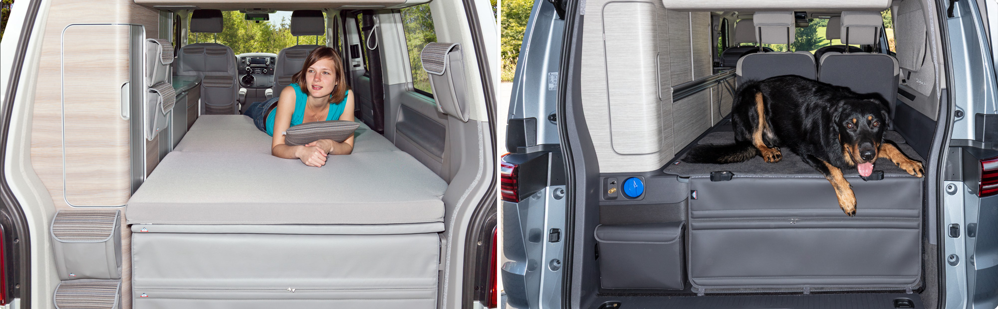 Plus d'espace de rangement et un confort de couchage encore plus grand. L'iXTEND PAD permet d'utiliser la rallonge de lit arrière du VW T6/T5 California Ocean, Coast/Comfortline pour dormir en position haute. Le lit rabattable iXTEND Allround offre également un excellent confort de couchage et permet de créer un niveau de chargement réglable en hauteur, sans aucune modification !