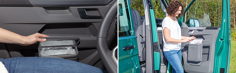MULTIBOX VW T6.1, la poche élégante qui s’adapte aux portières avant de tous les T6.1 VW. La MULTIBOX se fixe en haut à l’intérieur du vide-poches avec une bande contact autoagrippante et elle tient de même en bas avec une bande autoagrippante.