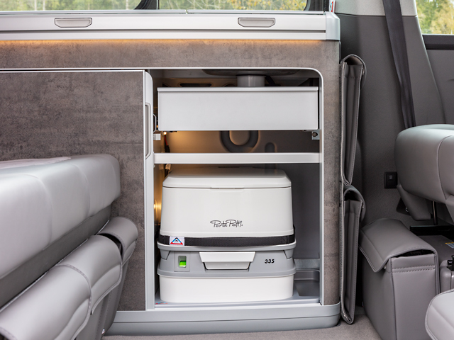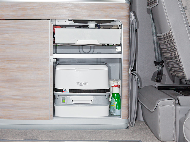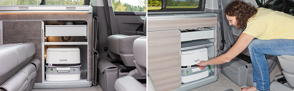 Toilettes « Porta Potti 335 » avec sangle de manutention et baquet de protection pour T6.1 / T6 / T5 VW California avec côté de l’évier