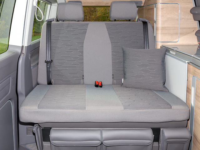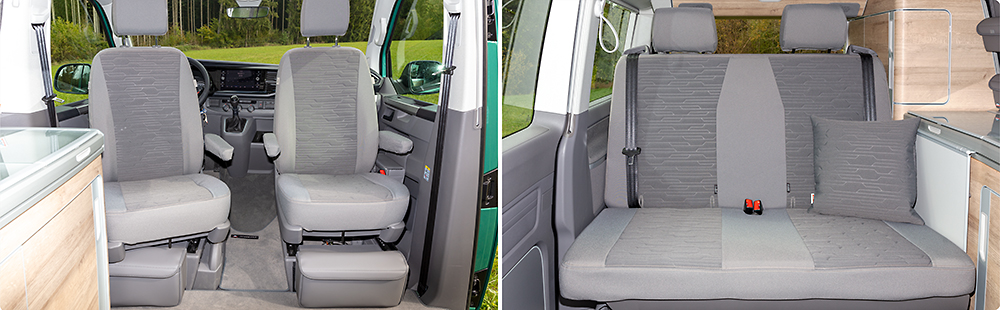 Les housses Second Skin correspondent au coloris du California Ocean / Coast T6.1 VW; elles sont fabriquées dans les tissus d’origine de Volkswagen, complètes avec les housses d’accoudoirs et d’appuie-tête.