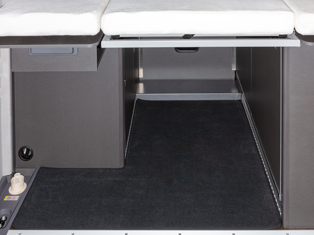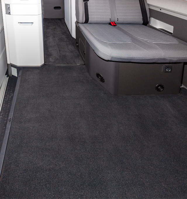 La surface correspond à la moquette d’origine des modèles California VW ; de surcroît l’envers est doublé d’une couche de gomme antidérapante qui abaisse davantage le niveau sonore.