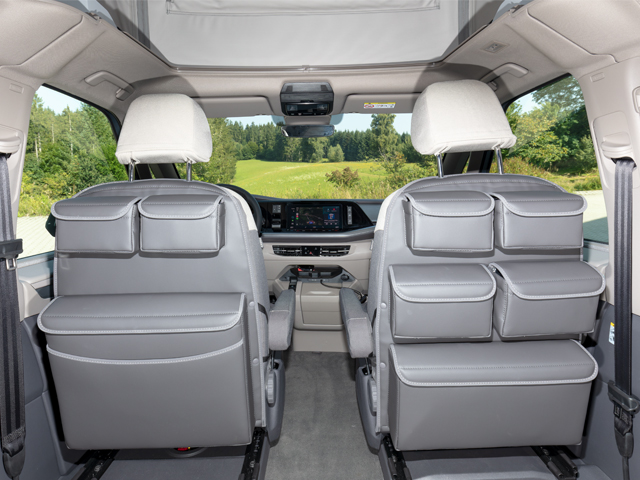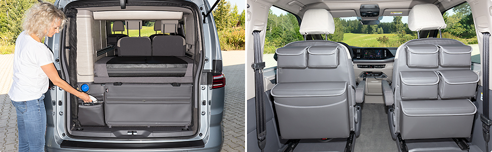 Les poches UTILITIES CALIFORNIA ® pour les VW T7 California Ocean/Coast, Beach Camper/Tour, Multivan permettent de gagner beaucoup de place grâce à leur disposition astucieuse, créant une atmosphère sophistiquée et agréable.