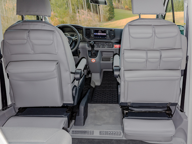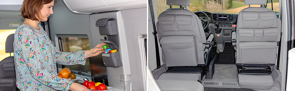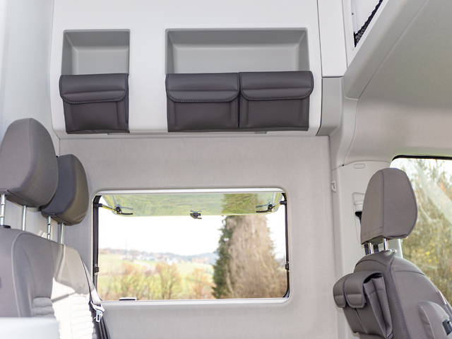 UTILITY avec deux poches pour l’armoire de rangement à droite au-dessus de l’ensemble banquette fauteuils du Grand California 680 VW, design « Palladium Cuir »